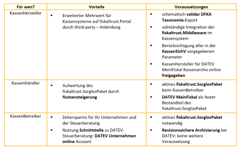 Erweiterung des fiskaltrust.SorglosPaketsMachen Sie mehr aus Ihren Kassendaten! Wir bieten Ihnen eine nahtlose Integration zwischen fiskaltrust und dem DATEV MeinFiskal ...
