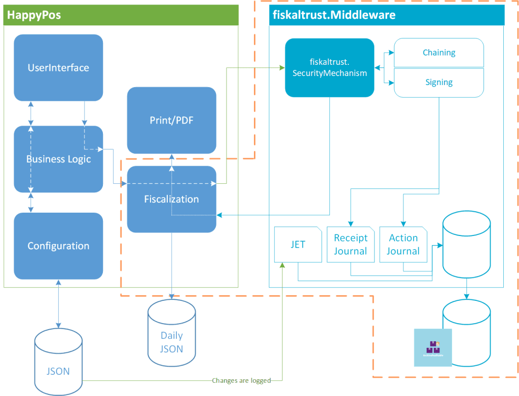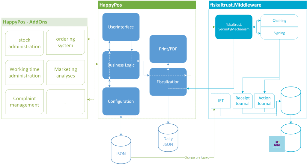 We immediately see the fiskaltrust.Middleware forms an independent block of POS system “HappyPos” and within the POS itself, there is a module “Fiscalization”. So to say, it is the ideal state to impose as few restrictions as possible on the developers. Because as we can see in the following picture, the “Fiscal Scope” is very clearly defined and does not spread over the whole system.