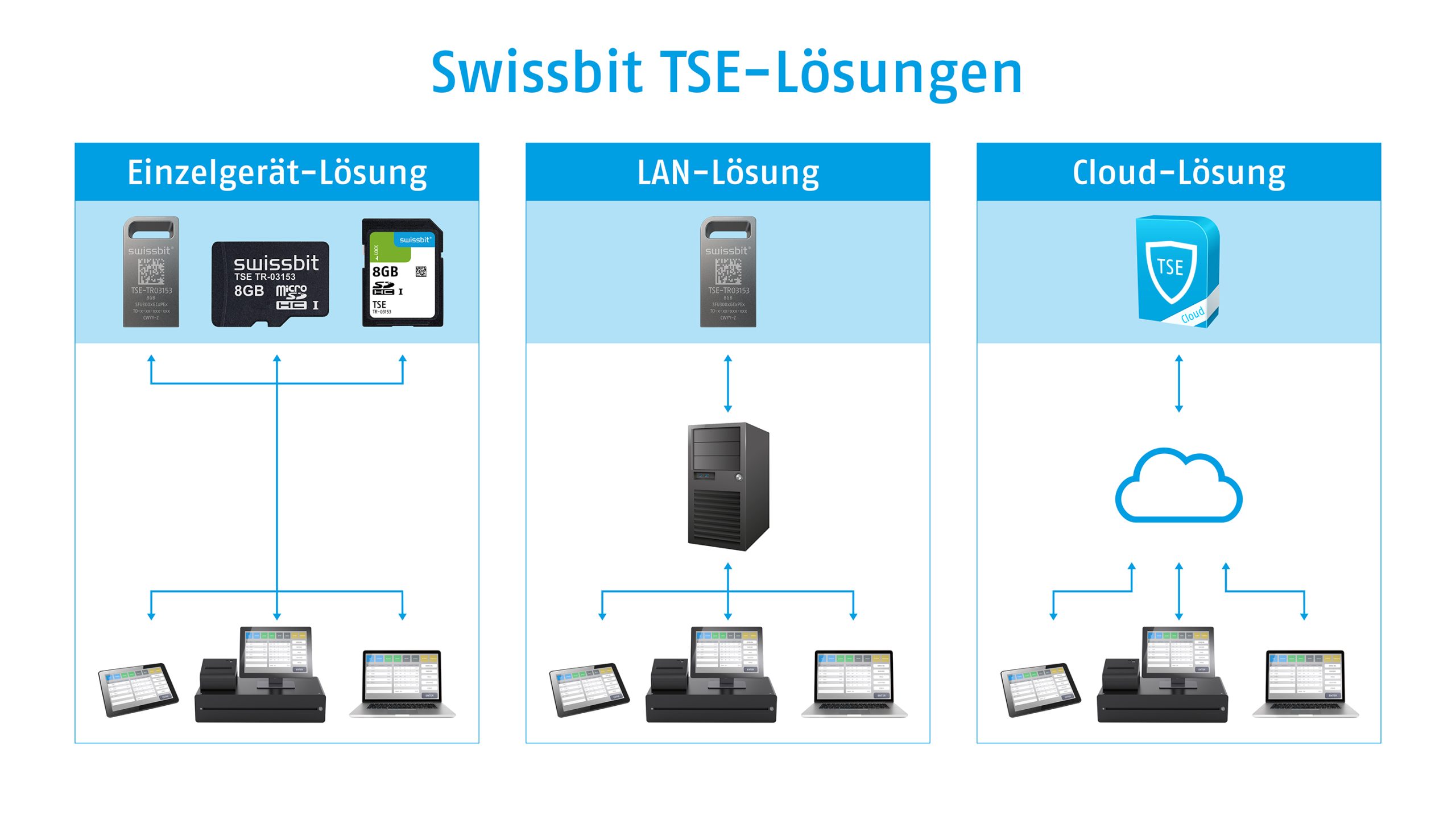 Die Swissbit TSE ist flexibel und skalierbar sowohl als Einzelgerät-, LAN- oder Cloud-Lösung verfügbar. Je nach Kundenanforderung können diese Technologien eingesetzt und sogar gemischt werden – jeweils in Verbindung mit der fiskaltrust.Middleware. Ein einfacher Wechsel der Technologien und die daraus resultierende Flexibilität ermöglicht immer den optimalen Einsatz entsprechend der jeweiligen kundenspezifischen Anforderungen.