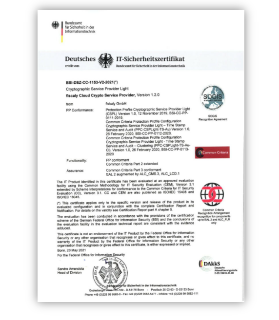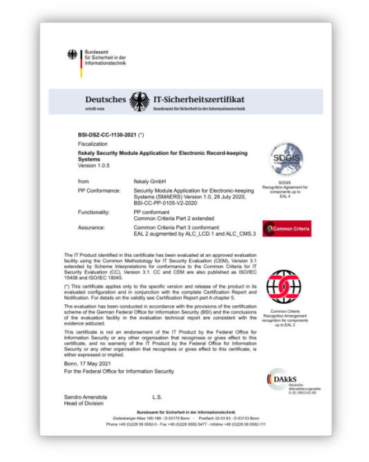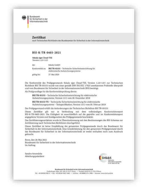 Am 28. Mai 2021 hat fiskaly die Zertifizierung Ihrer Cloud-TSE nach TR-03153 durch das BSI (Bundesamt für Sicherheit in der Informationstechnologie) bis 2029 erhalten. Sie ist somit die einzige Cloud-TSE mit einer vollen Zertifikatslaufzeit von 5 Jahren.