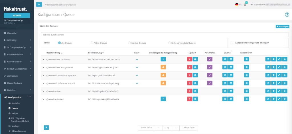 Um jedem Benutzer eine Überprüfung der wichtigsten Daten so einfach wie möglich zu gestalten, wurde durch fiskaltrust ein Datencheck auf jeder Queue in unserem Portal implementiert. Durch diese einfache und unkomplizierte Funktion erhalten Sie einen schnellen Überblick über die Datenqualität, wodurch etwaige Mängel eindeutig identifiziert werden.