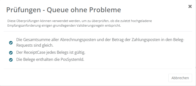 - Überprüfen Sie die Datenchecks Ihrer Queues und stellen Sie damit sicher, dass die Datenfelder korrekt befüllt und an fiskaltrust übertragen werden.